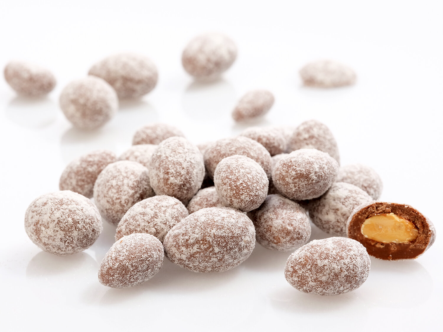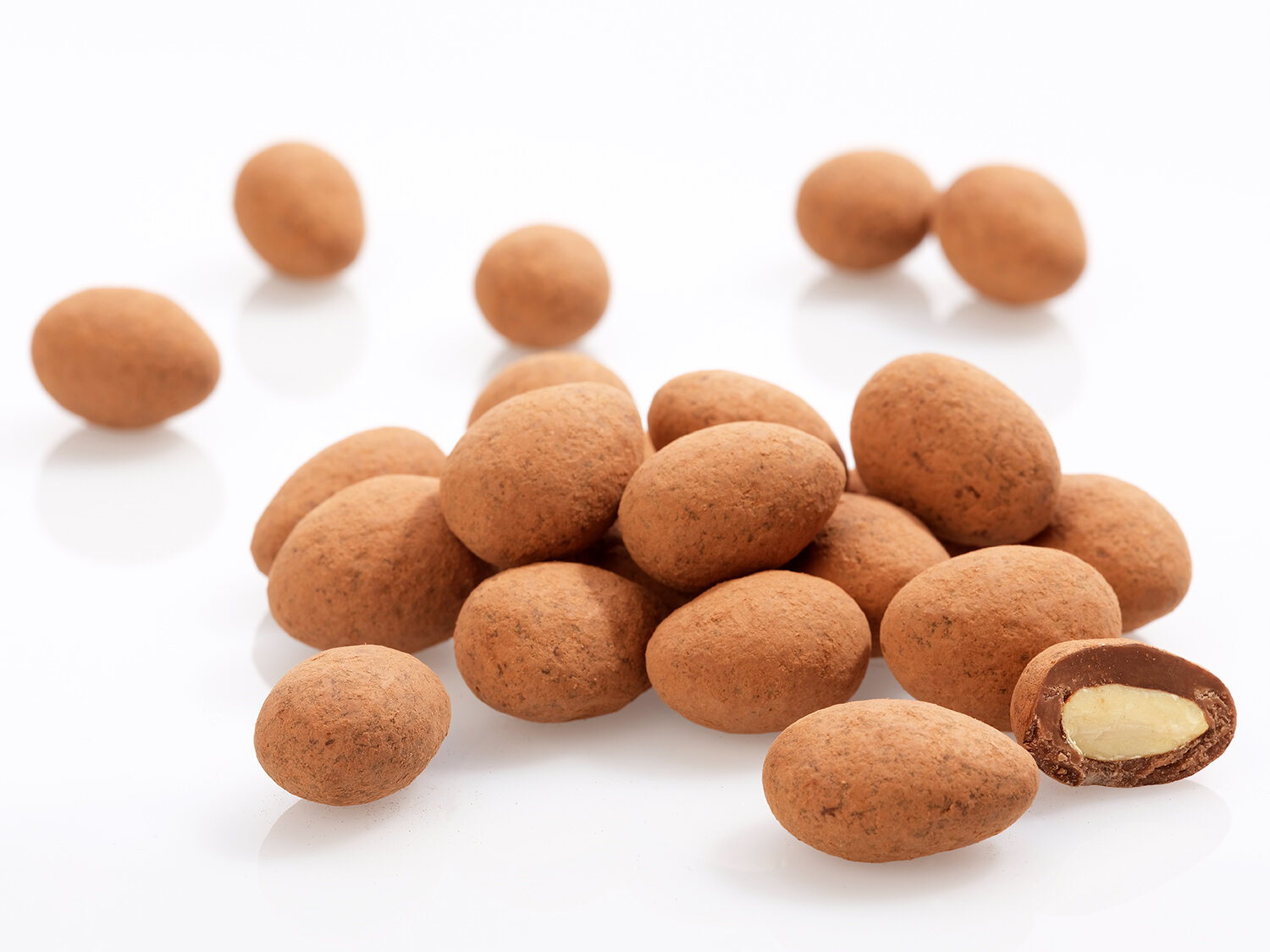 Zurück zu den industriell hergestellten dragierten Mandeln: Neben der Zuckerumhüllung / Zuckerummantelung findet man heute im Süßwarenhandel auch die unterschiedlichsten Schokoladenüberzüge ...