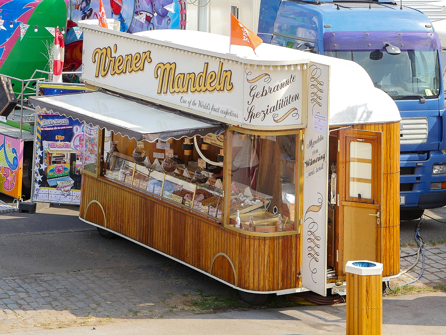 Ein Durchbruch für die Mandelbrennerei! Von jetzt an ist die Herstellung feuergebrannter Mandeln wesentlich einfacher, die Vermarktung explodiert auch in ländlichen Regionen, die verkauften Mengen wachsen rasant, die Menschen landauf, landab lieben die knackig-karamellige Spezialität. Wie hier 2018 in Düsseldorf: ein gut erhaltener typischer Mandelwagen aus den 1970er Jahren auf den Rheinwiesen.