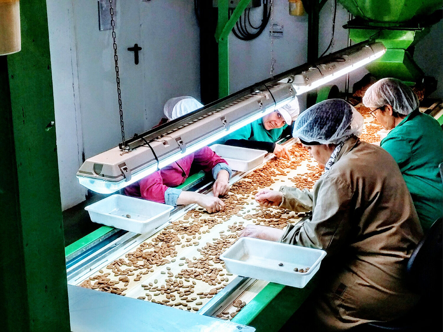 Mandelbrenner bevorzugen wegen des ausgeprägten Aromas lieber alte Sorten: Lange Zeit galt die Bari-Mandel aus Süditalien als Favorit, inzwischen werden ihrer schlanken Form wegen meist die Larguetas aus Spanien bevorzugt. Wie hier im katalanischen Maials: Arbeiterinnen bei der letzten Qualitätskontrolle per Hand.