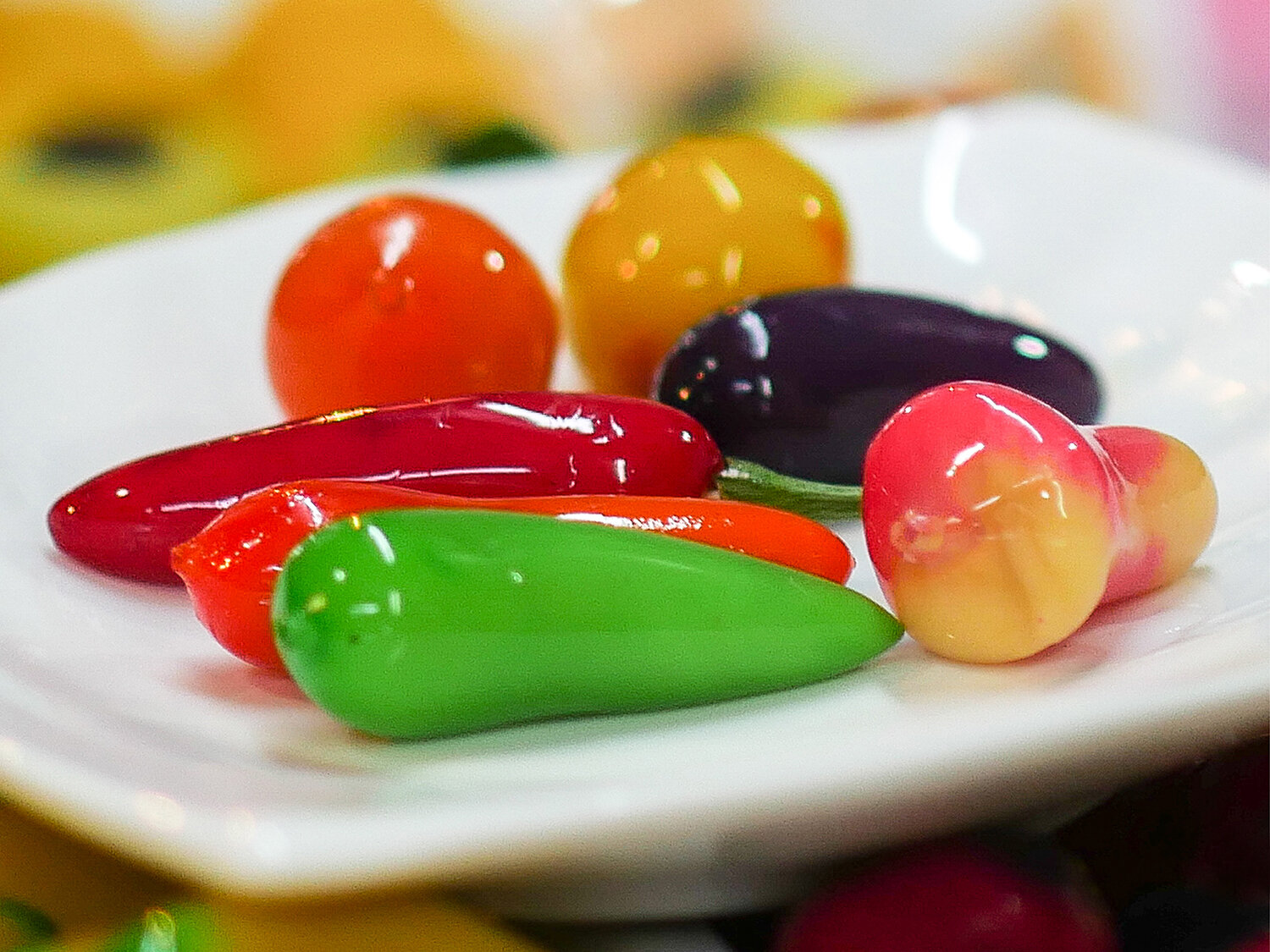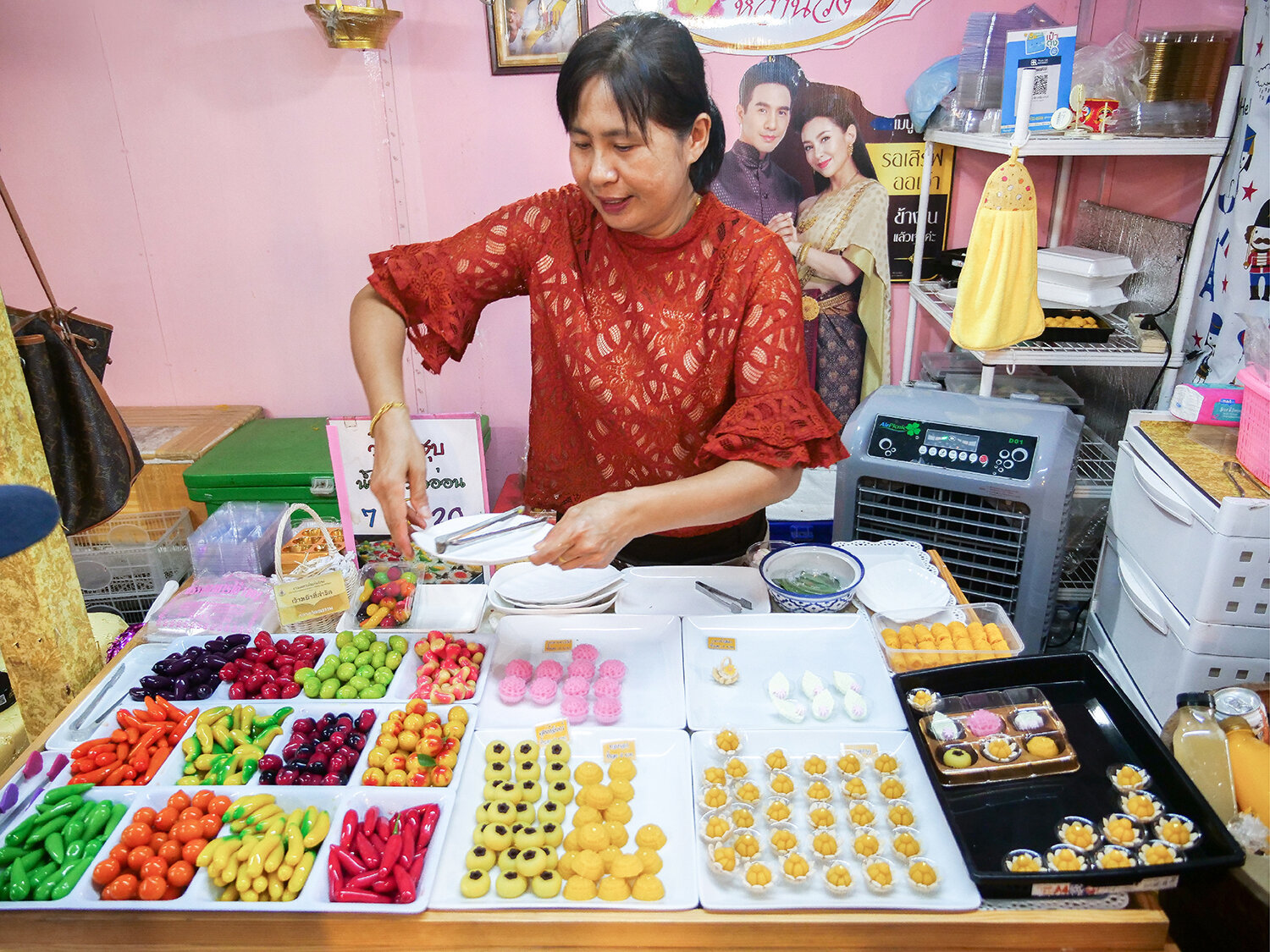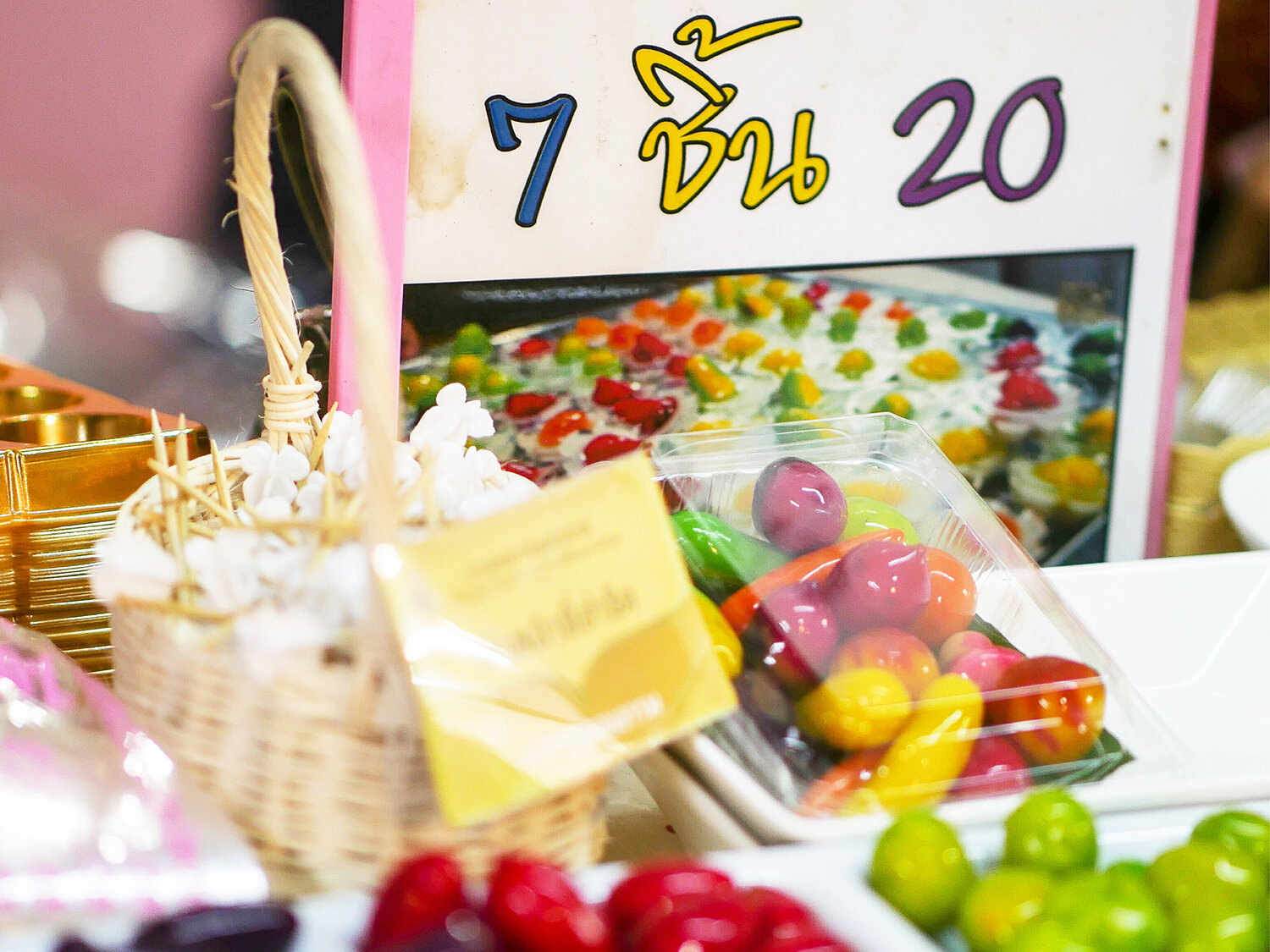 Was auf den ersten Blick aussieht wie Miniaturausgaben von Früchten wie Chilis, Kirschen, Orangen oder Mangos, Karotten oder Erdbeeren, ist – ähnlich wie unsere Marzipanfrüchte – ein mit höchstem handwerklichem Geschick gefertiges Kunstprodukt und in Thailand hoch beliebtes Dessert.
